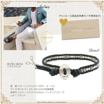 スターリングシルバーのボタン式の留め具にはCHAN LUUのロゴが刻まれ、約19cm、21.5cm、23.5cm、25cmの4段階でサイズ調整が可能ですので長すぎる場合は腕のサイズに合わせてはさみでカットしてください。